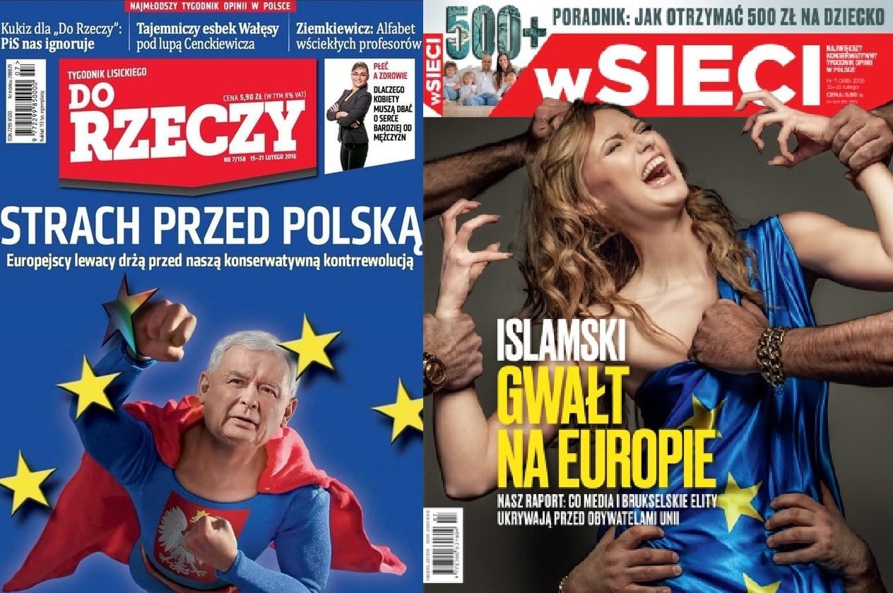 Okładka tego drugiego przedstawia lecącego Jarosława Kaczyńskiego w stroju Supermana, który wysuniętą pięścią nokautuje jedną z gwiazdek Unii Europejskiej. A nad nim napis: "Strach przed Polską. Europejscy lewacy drżą przed naszą konserwatywną kontrrewolucją". Z kolei "wSieci" na tytułowej stronie prezentuje długowłosą blondynkę, obdzieraną z flagi UE, która stanowi jej szatę. Oczywiście obdzierają mnogie ręce widocznie należące do osób ciemniejszej karnacji i wszystko kwituje napis: "Islamski gwałt na Europie. Nasz raport: co media i brukselskie elity ukrywają przed obywatelami Unii".